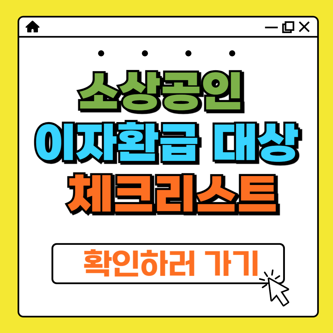 소상공인 이자환급 대상 체크리스트의 자가점검을 통해 본인이 지원대상에 해당하는지를 확인할 수 있으며, 체크리스트 모두 '예'에 해당하는 경우에만 신청과 조회가 가능합니다.